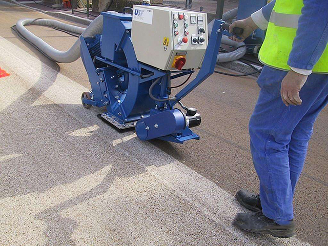 橋梁混凝土鋪裝層處理采用拋丸工藝,即利用拋丸機(jī),拋除混凝土表面的浮漿。使用拋丸處理的表面粗糙均勻;不會破壞原混凝土結(jié)構(gòu)和平整度,并且可以完全去除浮漿和起砂,100%“創(chuàng)面”、露骨;但同時不會造成骨料的松動和微裂紋,為增強(qiáng)混凝土與瀝青面層提供更好的粘結(jié)。